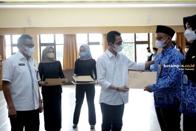 batampos.co.id – Sebanyak 130 Pegawai Negeri Sipil (PNS) di lingkungan Pemko Batam yang lulus tahun 2019 lalu menerima Surat Keputusan Pengangkatan yang diserahkan langsung oleh Wakil Wali Kota Batam, Amsakar Achmad, Selasa (30/11/2021).