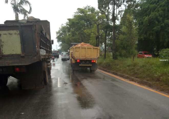 Truk yang membawa tanah melintas di jalan Brigjen Katamso, Tanjunguncang, Batuaji, Rabu (9/2). Padahal dalam aturannya, truk bermuatan wajib menutup muatannya dengan terpal, tetapi ini tidak. Tanah yang dibawa rawan tercecer yang mengotori jalan. (*)