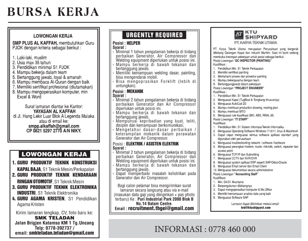Info Kota Ada Lowongan Kerja Nih, …. Yuk Cek Editor: Putut ATP Jumat, 7 Jul 2023 - 10:22 WIB Bagikan WhatsAppTelegramLINEFacebookTwitter Berita Terkait Dibutuhkan, Bidan, Perawat, Guru dan Staf Admin Info Kota Jumat, 7 Jul 2023 - 12:29 WIB Lowongan Kerja, Siapa Tahu Kamu Cocok Info Kota Kamis, 6 Jul 2023 - 10:44 WIB Iklan terbit di Harian Batam Pos edisi 7 Juli 2023 Bagikan WhatsAppTelegramLINEFacebookTwitter SALAM RAMADAN Kebab Shawarma Berpadu dengan Jajan Pasar di “A Wishful Ramadan” ARTOTEL Batam Sabtu, 21 Feb 2026 - 11:50 WIB Buka Puasa Sambil Nikmati Sunset, Ini 5 Tempat Favorit di Batam Jumat, 20 Feb 2026 - 15:33 WIB Surga Kuliner Ramadan! 4 Bazar Takjil di Batam yang Wajib Dicoba Kamis, 19 Feb 2026 - 16:03 WIB