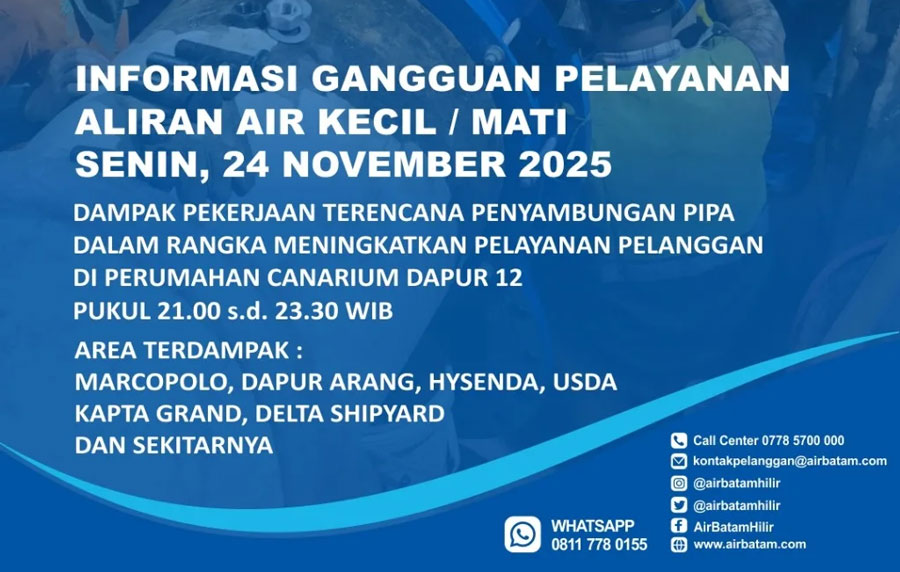 Sebagai langkah antisipasi, ABHi juga menyiagakan mobil tangki air minum bagi pelanggan yang mengalami gangguan suplai air hingga 1×24 jam. Permintaan distribusi air dapat dikoordinasikan melalui Ketua RT/RW atau pihak kelurahan setempat, kemudian disampaikan melalui kanal layanan resmi Air Batam Hilir berikut: