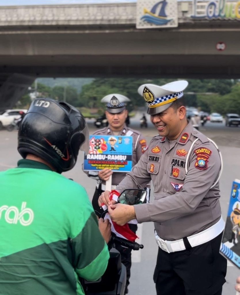 batampos – Satuan Lalu Lintas (Satlantas) Polresta Barelang membagikan bendera Merah Putih kepada para pengendara di Simpang Flyover Laluan Madani, Kamis (7/8). Bendera yang dibagikan mencapai 200 lembar.