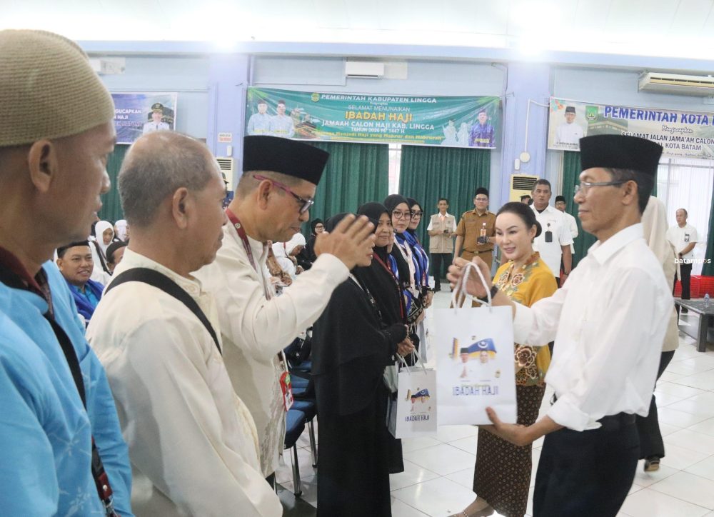 batampos – Wali Kota Batam sekaligus Kepala BP Batam, Amsakar Achmad, bersama Wakil Wali Kota Batam sekaligus Wakil Kepala BP Batam, Li Claudia Chandra, menyerahkan bingkisan kepada 257 Jemaah Calon Haji (JCH) kloter pertama di Asrama Haji Batam Center, Selasa (21/4) sore.