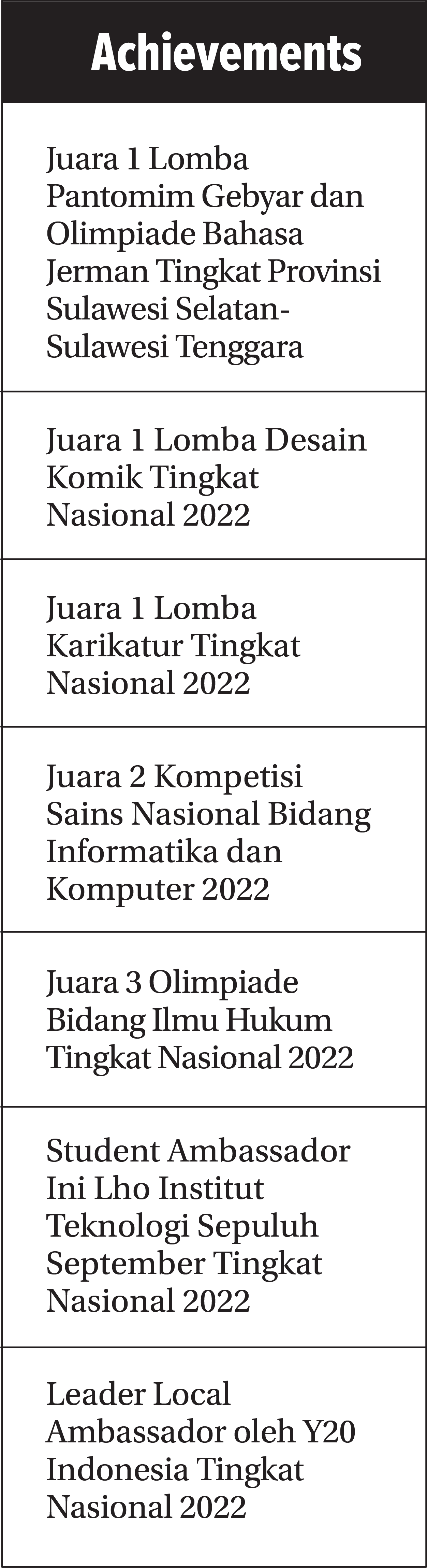 ’’Menurut aku, kesuksesan kita membagi waktu di sekolah dan luar sekolah kuncinya adalah disiplin dan konsisten. Dua kata itu yang selalu aku pegang dan laksanakan sejak masih di bangku sekolah. Mudah diucapkan, tetapi sedikit sulit dipraktikkan. Jadi, butuh yang namanya konsisten. Jika tidak menanamkan kedisiplinan dan konsistensi pada segenap jiwa raga, jadwal yang kita buat semuanya akan sia-sia,’’ ujar gadis kelahiran Makassar itu.