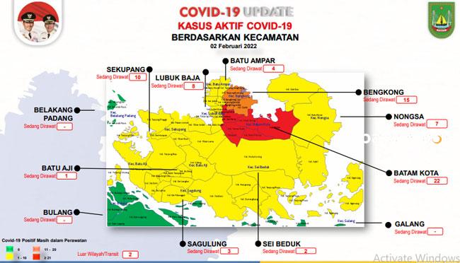 Peta penyebaran kasus aktif Covid-19 di Kota Batam hingga Rabu (2/2/2022). Di dalam peta tersebut terlihat Kecamatan Batam Kota sudah zona merah. Foto: Tangkapan layar