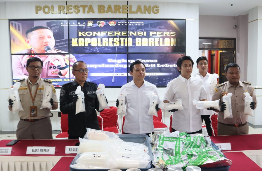 Kasat Reskrim Polresta Barelang AKP Debby Tri Andrestian bersama, Kanit 5 , Kasihumas Polresta Barelang dan Balai Karantiana Ikan menunjukan barang bukti bibit lobster yang berhasil diamankan saat ekspos di Mapolresta Barelang, Rabu (5/2). F Cecep Mulyana/Batam Pos