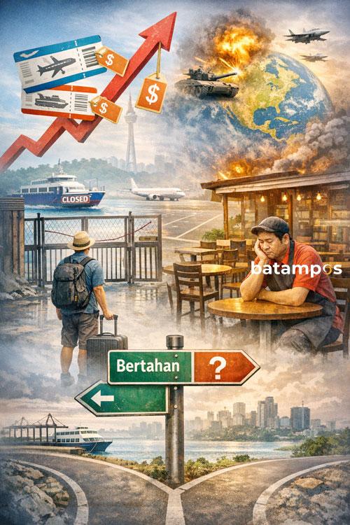 Biaya perjalanan melonjak tajam akibat konflik global, dan Batam kini menjadi salah satu daerah yang paling merasakan efek berantainya, dari tiket pesawat, tarif feri, hingga daya beli masyarakat. Ketika mobilitas mulai tersendat, dampaknya bakal menjalar ke mana-mana: wisatawan menahan kunjungan, pelaku usaha mengeluh, hingga ancaman inflasi dan perlambatan ekonomi kian nyata di depan mata. Batam kini di persimpangan: bertahan atau terseret ketidakpastian.