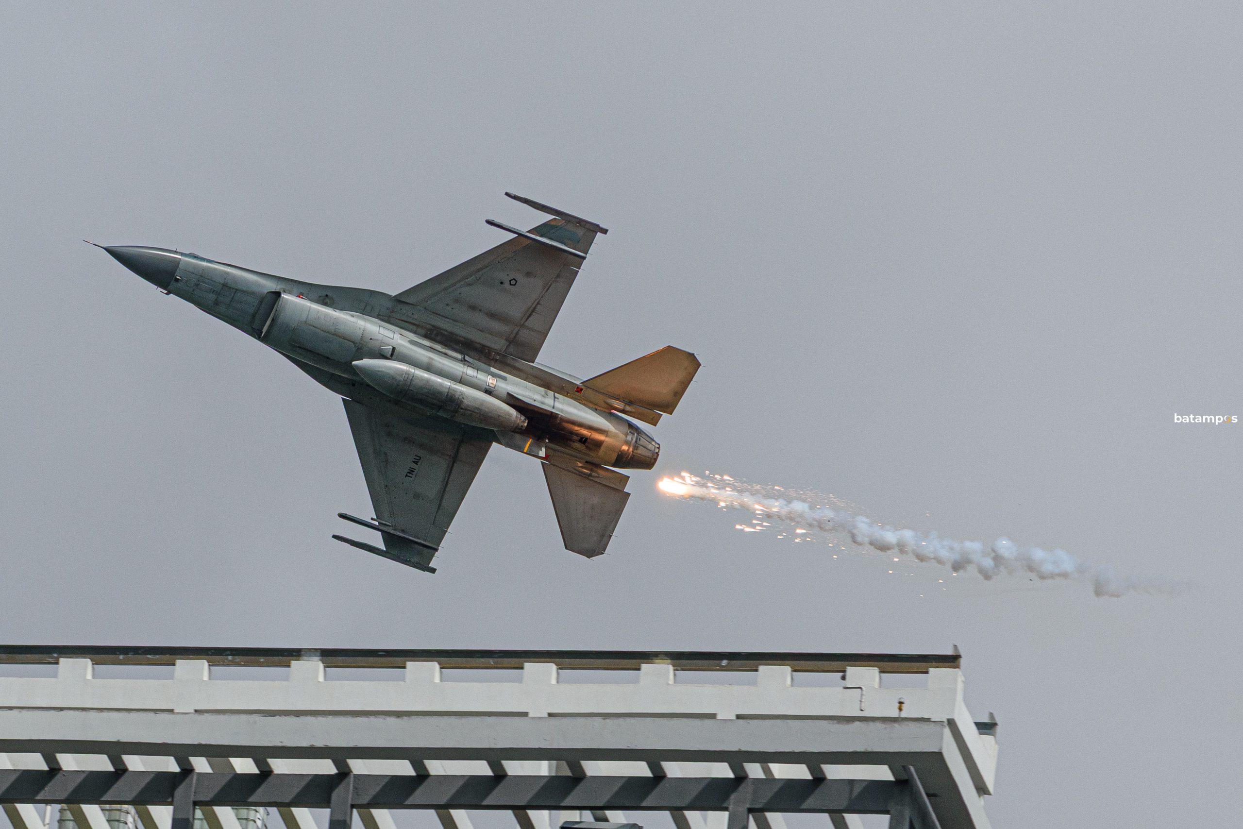 Momen penentunya terjadi saat jet tempur F-16 melintas di langit Batam sambil melepas flare, menciptakan visual dramatis yang hanya berlangsung singkat. Dalam momen tersebut, saya mengambil beberapa frame, dan salah satu hasilnya kemudian digunakan Batam Pos sebagai visual pesawat di bagian atas halaman depan koran.