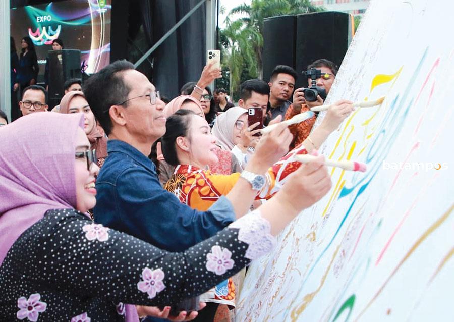 (ki-ka): Ketua Dekranasda Batam, Erlita Amsakar, Wali Kota Batam, Amsakar Achmad, bersama Wakil Wali Kota Batam, Li Claudia Chandra, dan membatik bersama dalam satu kain saat pembukaan Expo Batam Batik Fashion Week (BBFW) 2025 di Dataran Engku Putri, Batam Center, Kamis (2/10).