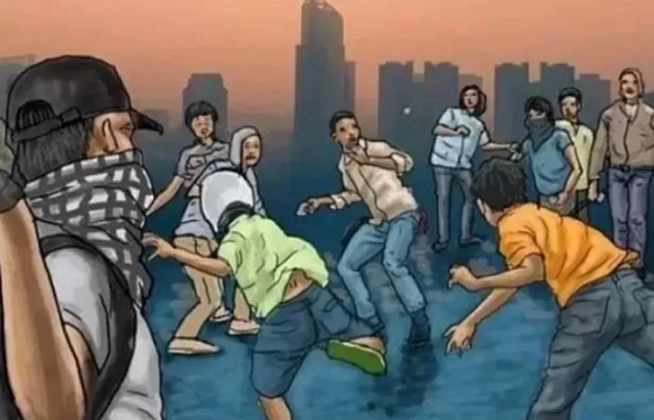Ia melihat kelompok anak muda tersebut mengejar kelompok lainnya menggunakan broti dan melempar batu.