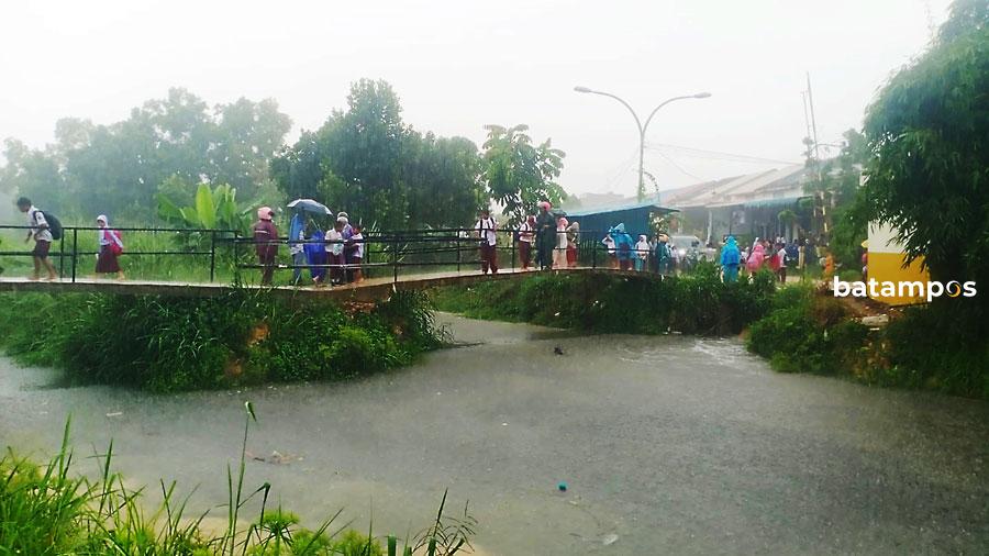 batampos – Jembatan penyeberangan murid SDN 013 Sekupang membutuhkan perhatian serius dari Pemko Batam. Pasalnya, jembatan yang melintang di atas saluran drainase besar ini minim pengaman. Tidak ada atap penutup jembatan, sehingga murid kebasahan saat hujan.
