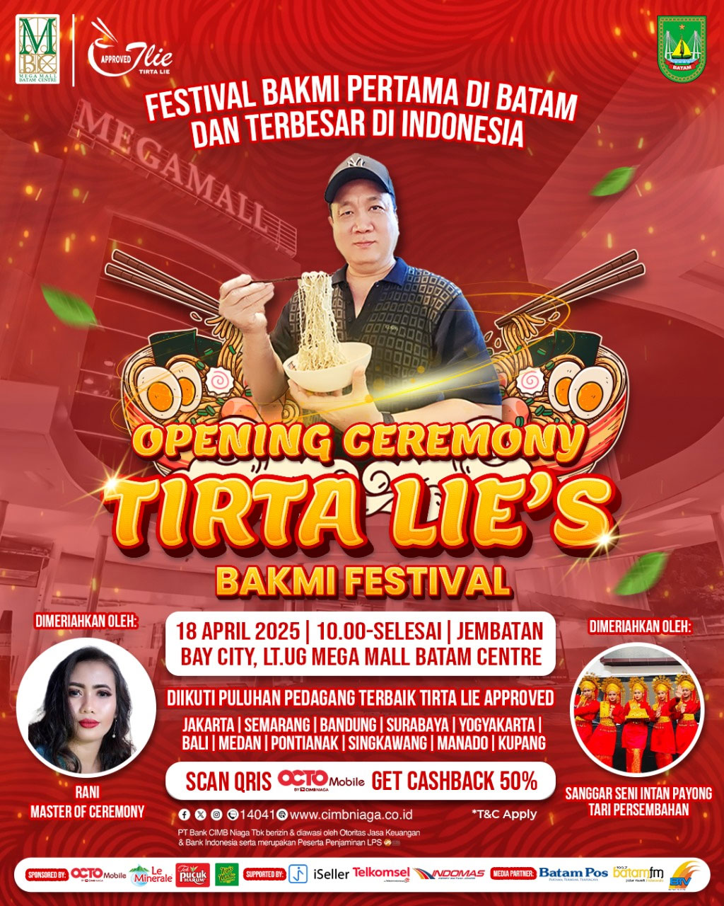 Buat warga Batam silahkan mengunjungi Tirta Lie’s Bakmi Festival di Mega Mall Batam Centre tepatnya di Jembatan Bay City Lantai UG pada tanggal 18 – 27 April 2025. (*)