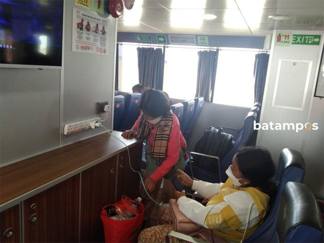 Suasana penumpang di dalam kapal Dumai Line Group. Meski kasus Covid-19 di Kota Batam melandai, para penumpang kapal diminta untuk tetap menjalankan protokol kesehatan dan membawa bukti negatif Covid-19 saat akan bepergian dengan transportasi laut. Foto: Dalil Harahap/Batam Pos