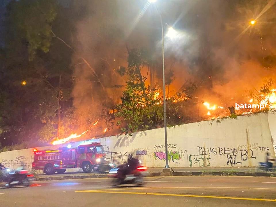 batampos – Kebakaran lahan kembali terjadi di Kota Batam. Kali ini api melalap lahan kosong di tepi jalan dekat Terowongan Pelita, kawasan Sei Panas, Batam Kota, pada Senin (9/3) malam sekitar pukul 20.00 WIB.