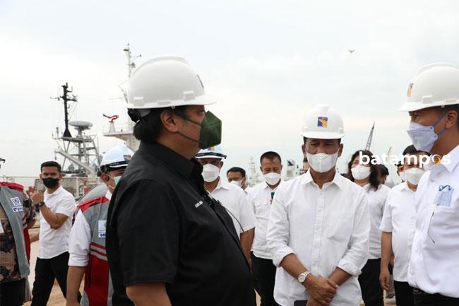 Menteri Koordinator Bidang Perekonomian Airlangga Hartarto (kemeja hitam) meninjau pembangunan Pelabuhan Container Batu Ampar. Foto: BP Batam untuk Batam Pos
