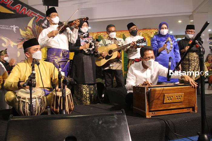 Wakil Wali Kota Batam, Amsakar Achmad, bersama Sekda Kota Batam, Jefridin, dan tamu undangan lainnya memainkan alat musik saat membuka acara Kenduri Seni Melayu di Kepri Mall, Kamis (9/12/2021).
