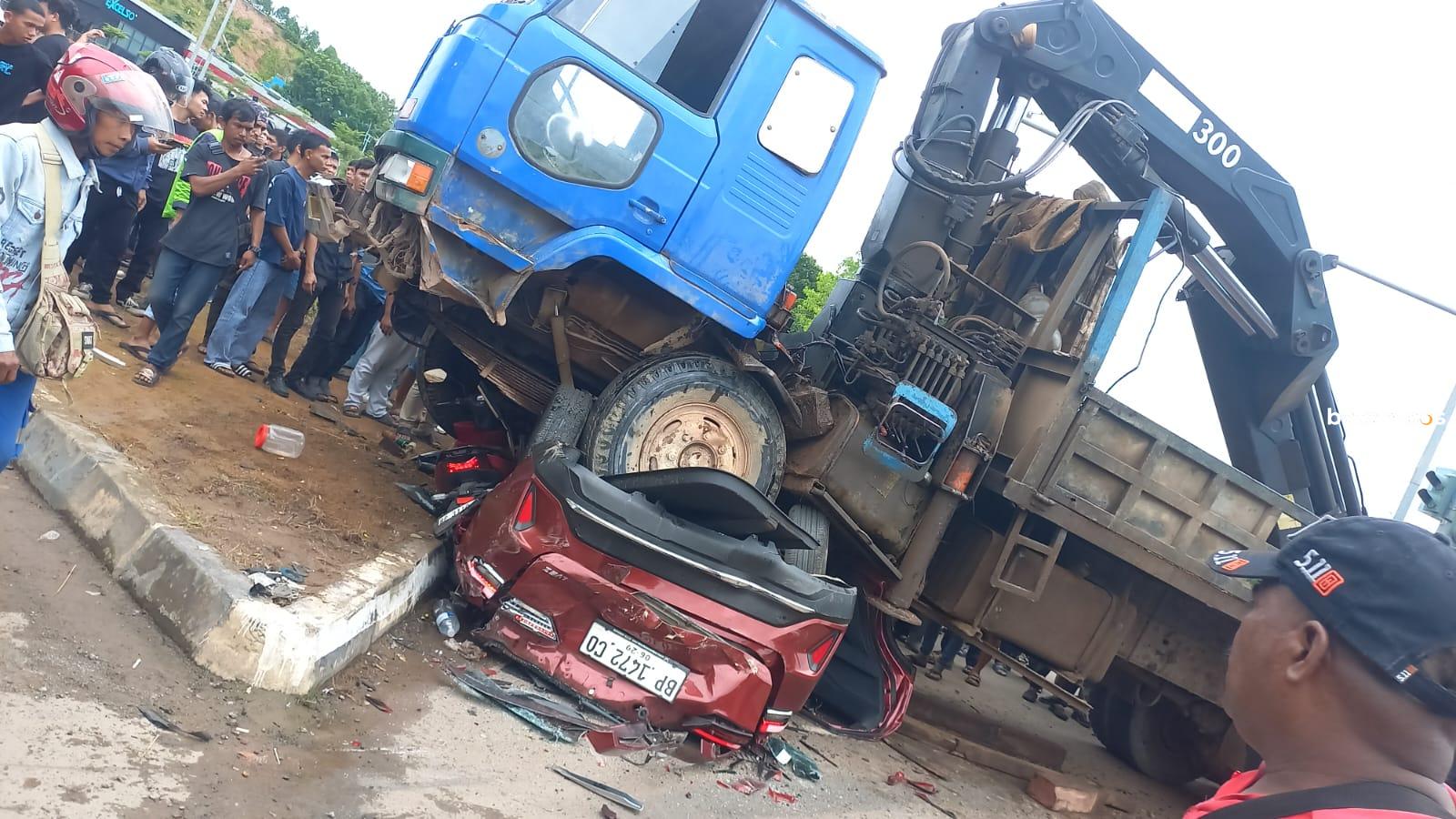 batampos– Kecelakaan lalu lintas terjadi di kawasan Tiban Center pada Sabtu (30/8/2025). Sebuah mobil trailer crane yang melaju dari arah Sekupang menuju Tiban Center menabrak sebuah kendaraan SUV berwarna merah maroon serta sebuah sepeda motor.