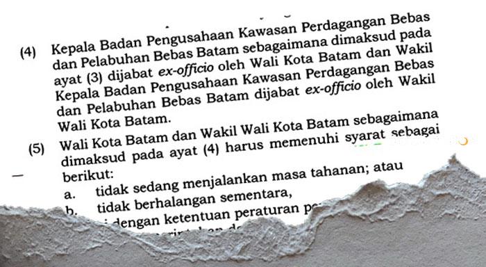 “Kepala Badan Pengusahaan Kawasan Perdagangan Bebas dan Pelabuhan Bebas Batam sebagaimana dimaksud pada ayat (3) dijabat ex-officio oleh Wali Kota Batam, dan Wakil Kepala Badan Pengusahaan Kawasan Perdagangan Bebas dan Pelabuhan Bebas Batam dijabat ex-officio oleh Wakil Wali Kota Batam.”