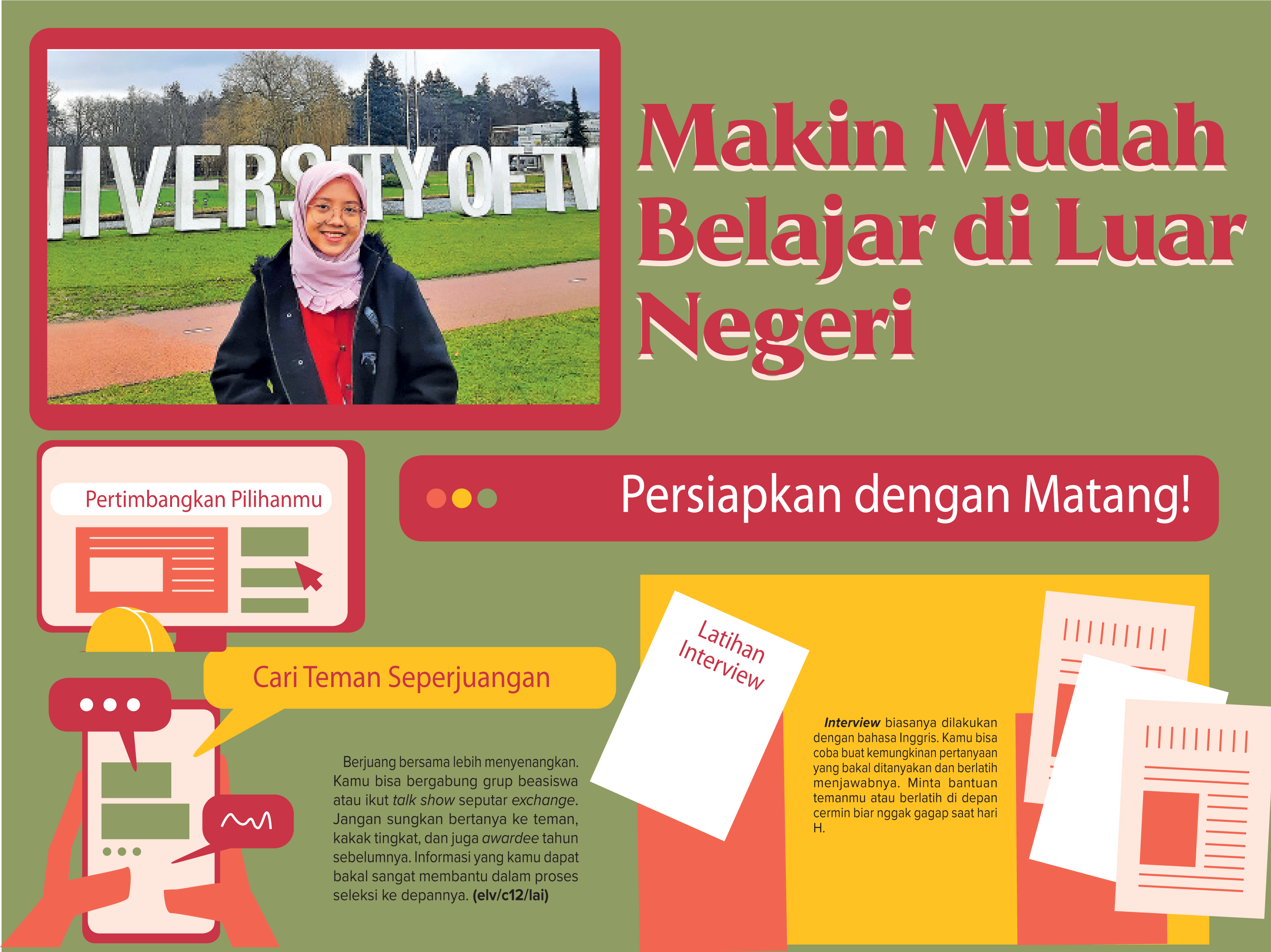 ’’Yang cukup sulit adalah ketika memilih universitas dan membuat esai. Aku berkonsultasi dengan dosen wali, kepala program studi, dan orang tua untuk memutuskan universitas dan negara mana yang nantinya aku tinggali,’’ jelas mahasiswa Universitas Airlangga itu.