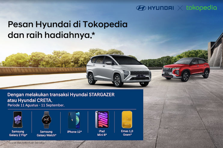 batampos – Bertepatan dengan perhelatan GAIKINDO Indonesia International Auto Show (GIIAS) 2022, PT Hyundai Motors Indonesia (HMID) bekerjasama dengan Tokopedia dalam menghadirkan program hadiah langsung untuk setiap transaksi pembelian Hyundai CRETA dan Hyundai STARGAZER melalui dealer resmi Hyundai yang terdaftar di Tokopedia dengan mengikuti S&K yang berlaku. Program ini berlangsung selama 11 Agustus-11 September 2022. Pelanggan dapat melakukan pemesanan dan mengunjungi laman resmi Hyundai Motors Indonesia melalui website serta aplikasi Tokopedia pada link ini.
