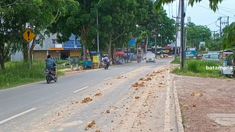 batampos- Pengguna jalan Marina City merasa tak nyaman dengan gumpalan tanah basah yang berceceran di sepanjang jalan. Gumpalan lumpur ini membuat jalan jadi licin dan kotor. Sumbernya adalah truk pengangkut tanah yang sedang melakukan pematangan lahan di dekat perumahan Jupiter, Marina.