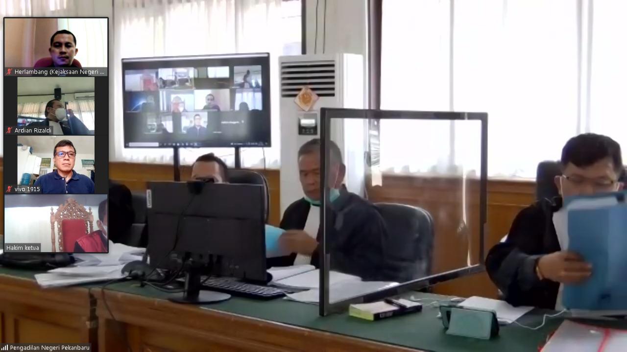 Sidang PK terpidana Mindo digelar di Pengadilan Negeri Pekanbaru, Selasa (16/11/2021). Gelaran sidang dilaksanakan secara virtual dan dihadiri jaksa penuntut umum (JPU) Herlambang, kuasa hukum Mindo dan terpidana Mindo dari Lapas Pekanbaru.