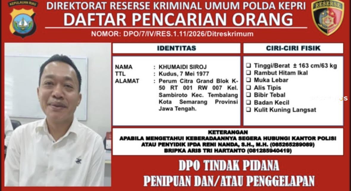 batampos – Polda Kepri menetapkan seorang pria berinisial KS alias Khumaidi Siroj sebagai daftar pencarian orang (DPO) dalam kasus dugaan penipuan dan penggelapan. Pria berusia 49 tahun ini diduga menipu seorang mantan kepala daerah di Kepri (ex Bupati Natuna) hingga merugi miliaran rupiah.
