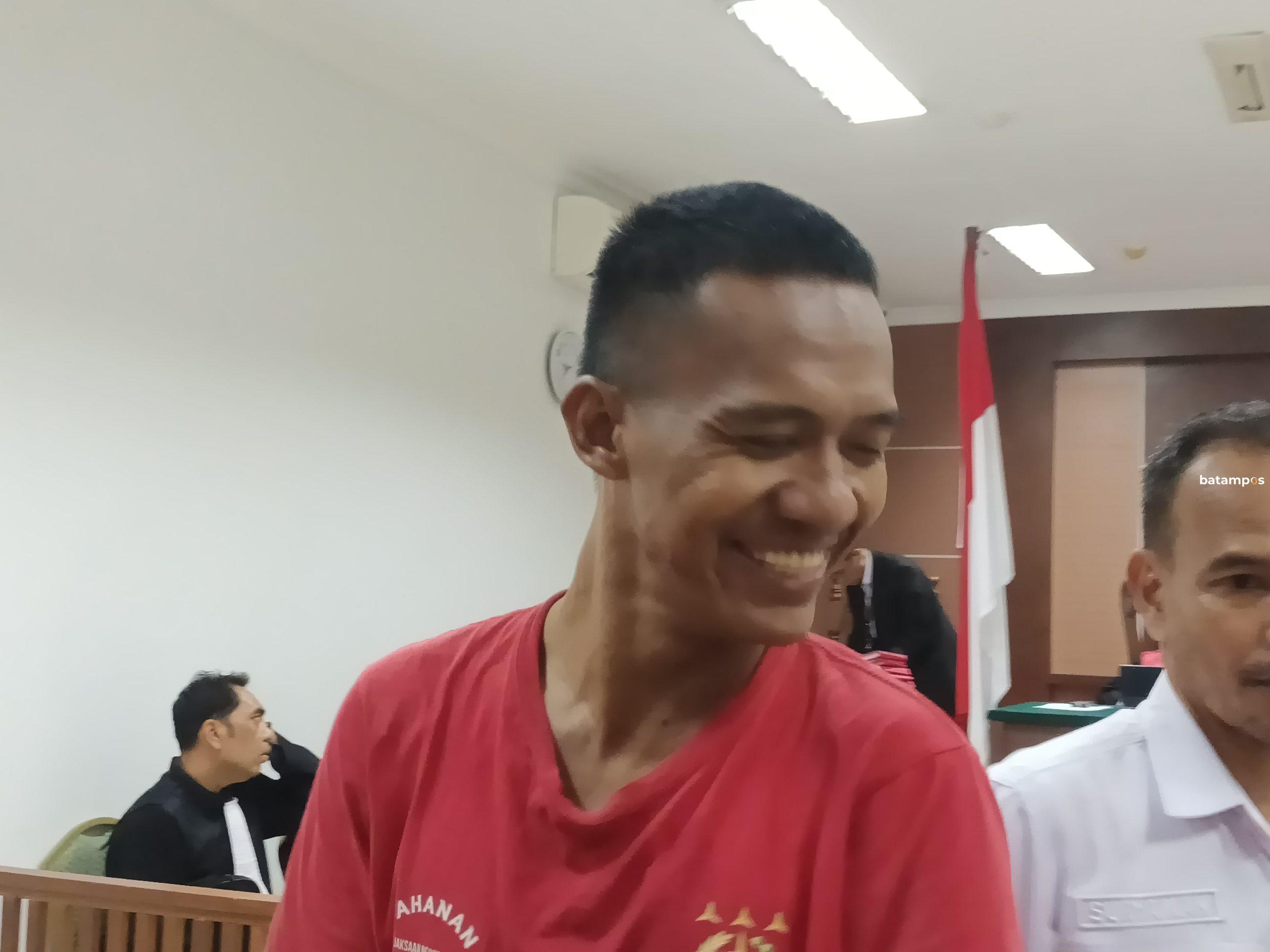 Mawanto bin Marjohan (35), terdakwa kasus penipuan dengan modus menyamar sebagai anggota polisi dan merampas empat unit telepon genggam milik remaja usai sidang di PN Batam. Foto. Aziz Maulana/ Batam Pos