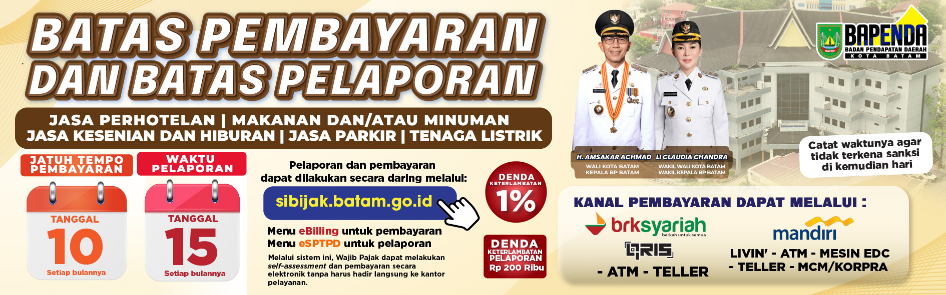 Untuk menjaga kesinambungan penerimaan daerah, Badan Pendapatan Daerah Kota Batam (Bapenda) mengingatkan Wajib Pajak agar memenuhi kewajiban tepat waktu setiap bulan: