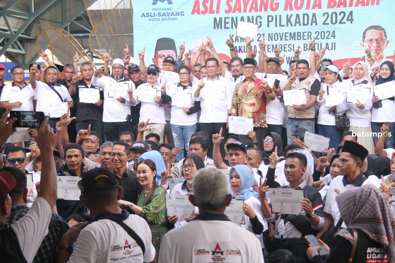 batampos – Paslon Wali Kota dan Wakil Wali Kota Batam, Amsakar Achmad-Li Claudia Chandra (ASLI), serta pasangan calon Gubernur dan Wakil Gubernur Kepulauan Riau, Ansar Ahmad-Nyanyang Harris Pratamura (SAYANG), menyerahkan lebih dari 6.000 sertifikat penghargaan kepada relawan yang telah berjuang mendukung mereka. Acara tersebut berlangsung di Pakuba, Batuaji, Batam, Kamis (21/11).