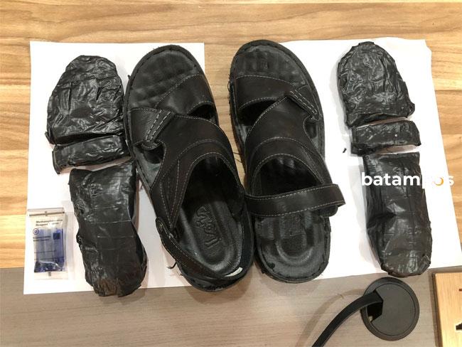 Personel Bea Cukai Batam lantas membongkar alas kaki tersebut dan menemukan kristal putih yang dilapisi dengan lakban warna hitam.
