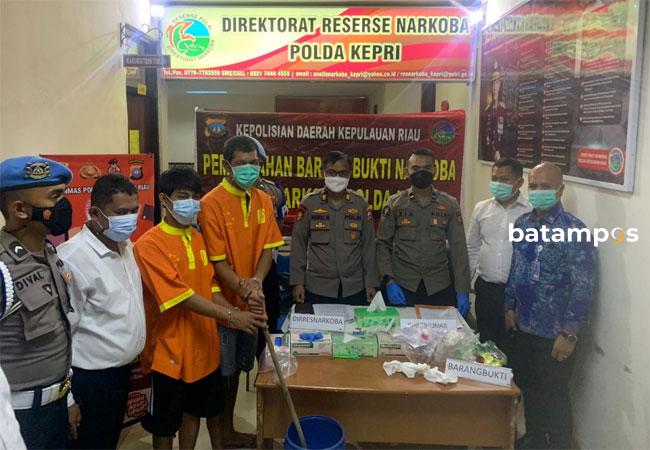 Dua orang tersangka MR alias R, dan E alias W, barang bukti berupa sabu yang dimusnahkan dengan cara direbus air panas. Foto: Polda Kepri