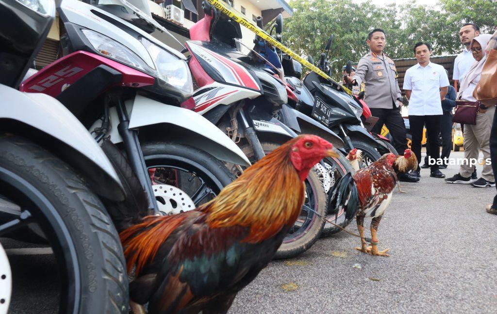Selain 7 orang, polisi turut mengamankan barang bukti berupa uang tunai Rp 10 jutaan, 14 ekor ayam adu, 85 unit motor, 6 unit mobil, dan buku catatan.