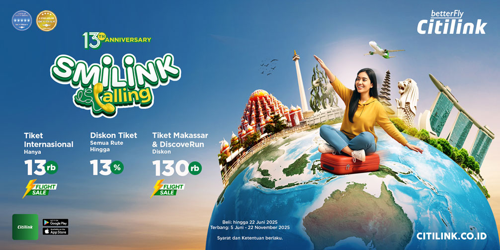 Yuk ke Singapura atau Makassar di liburan sekolah anak bareng Citilink! Smilink is Calling di ulang tahun Citilink yang ke-13. Dapatkan promo serba 13, seperti tiket internasional hanya 13 ribu, diskon 130 ribu terbang dari dan ke Makassar, diskon 130 ribu tiket event lari DiscoveRun 2025, dan juga diskon 13% terbang ke seluruh rute Citilink. Pesan tiketnya sekarang di www.citilink.co.id atau Aplikasi Citilink karena promo ini hanya berlaku hingga tanggal 22 Juni 2025. (*)