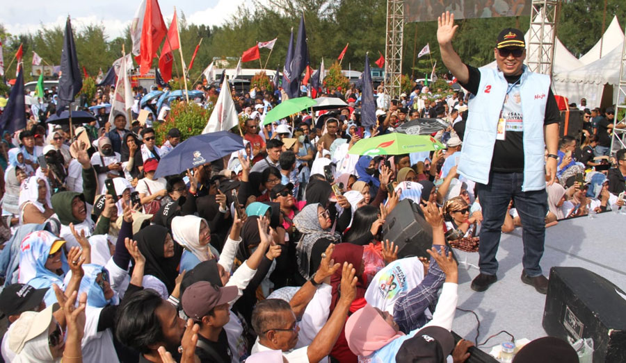 batampos – Pasangan calon (paslon) gubernur Kepri Ansar Ahmad, dan wakil gubernur Nyanyang Haris Pratamura disambut ribuan massa saat kampanye akbar di Ocarina, Batam center, Sabtu (23/11/2024).