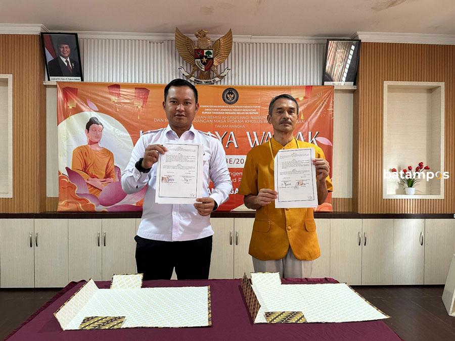 batampos – Rumah Tahanan Negara (Rutan) Kelas IIA Batam memberikan remisi khusus Hari Raya Waisak 2569 BE / Tahun 2025 kepada enam warga binaan pada Senin (12/5). Pemberian remisi ini dirangkaikan dengan penandatanganan kerja sama antara Rutan Batam dan Majelis Agama Buddha Theravada Indonesia (Magabudhi) Cabang Kota Batam.