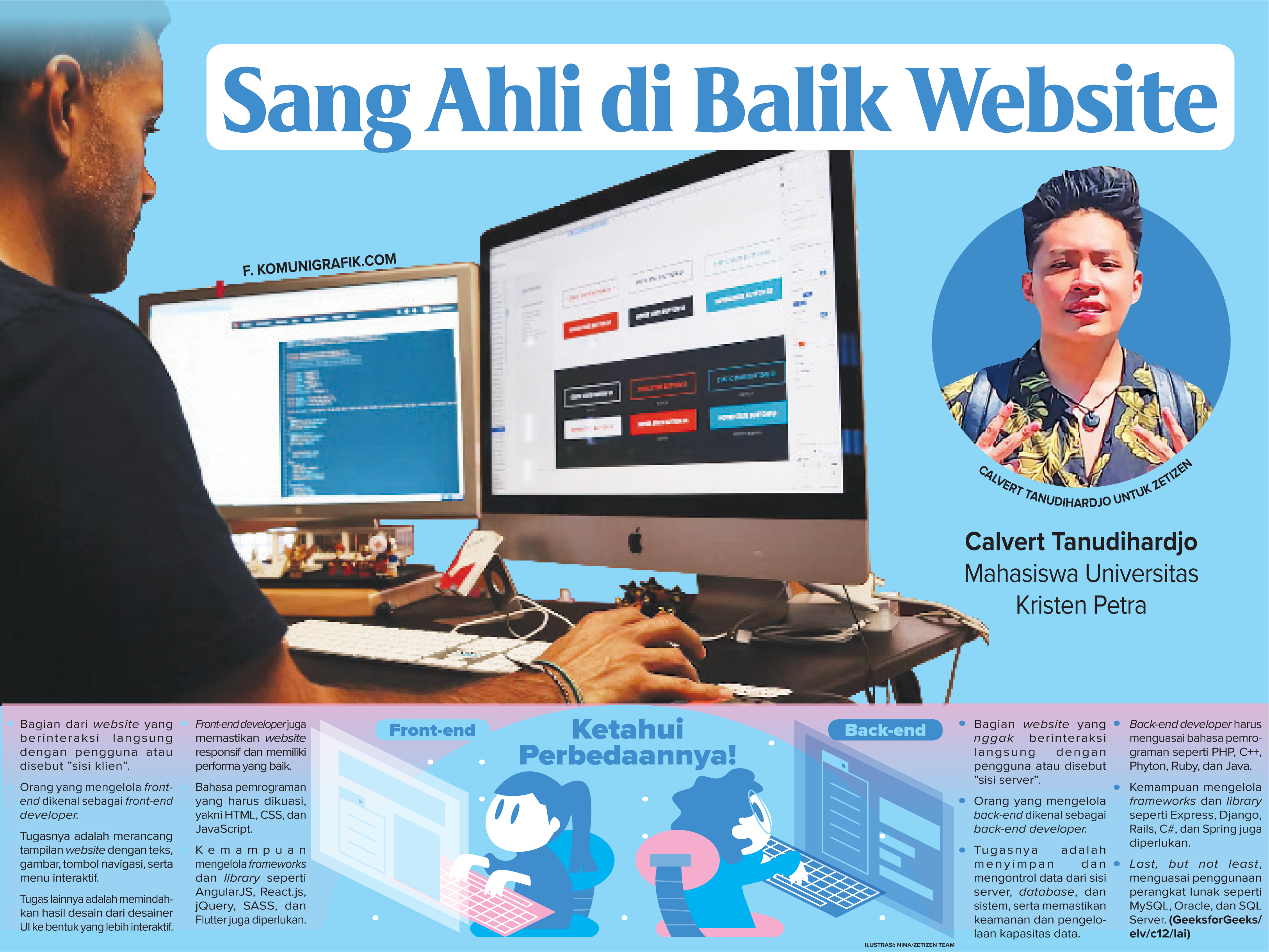 batampos – Web terus berkembang semakin kompleks. Hal itu membuat tugas seorang developer menjadi lebih spesifik. Nggak lagi membangun keseluruhan web, tetapi berfokus pada bagian tertentu. Nah, kali ini Zetizen bakal ulik salah satu spesialisasi kerja web developer. Ada Calvert Tanudihardjo yang bakal sharing pengalaman magangnya sebagai back-end developer. (elv/c12/lai)