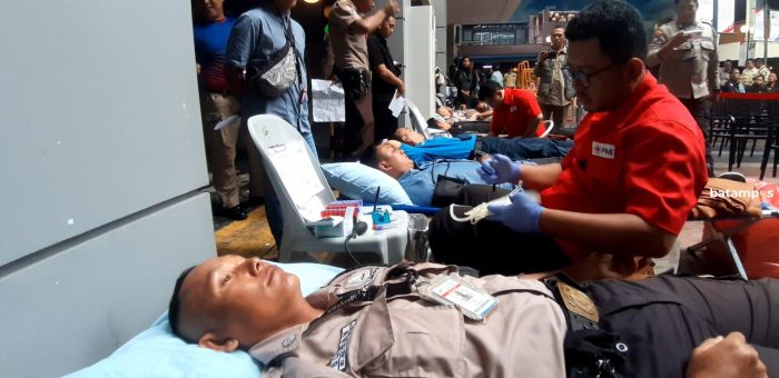 batampos– Ratusan personil Satuan Pengamanan (Satpam) dari berbagai Badan Usaha Jasa Pengamanan (BUJP) di Kepri menggelar baksi sosial dengan melaksanakan donor darah yang diikuti 500 an Satpam di Nunos, Sukajadi Kota Batam, Rabu (10/1).