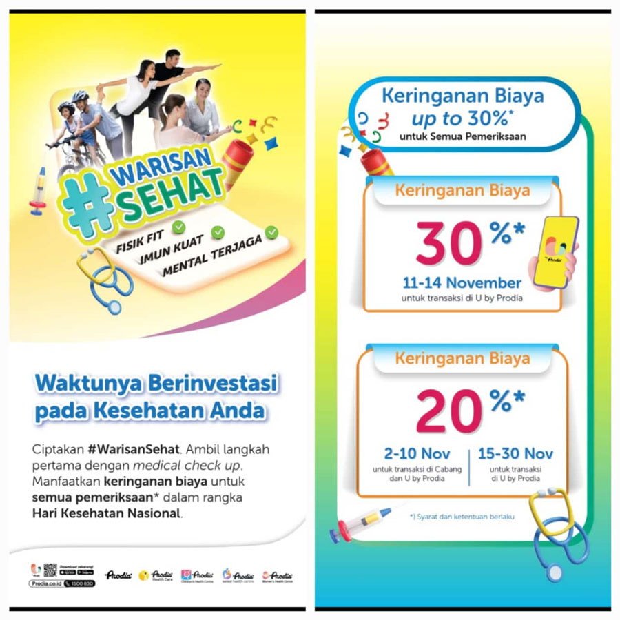 Untuk mendukung masyarakat dalam berinvestasi pada kesehatan, Prodia memberikan keringanan harga hingga 30% untuk semua pemeriksaan selama bulan November 2024. Anda dapat memanfaatkan penawaran ini melalui aplikasi U by Prodia atau langsung mengunjungi cabang Prodia terdekat. Informasi lebih lengkap tersedia di www.prodia.co.id.
