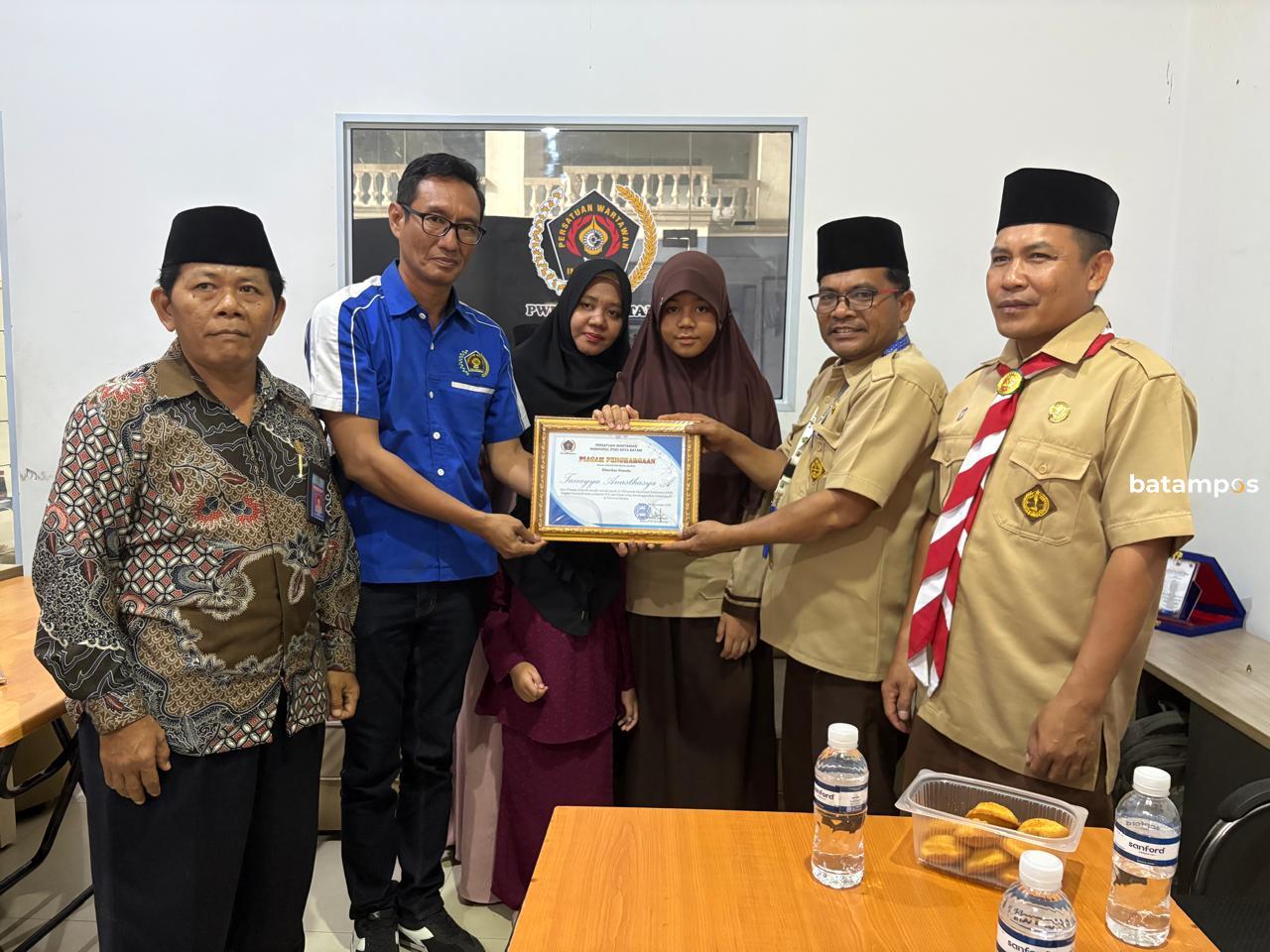 Thanaya hadir bersama ibunya, Vina Mawaddah Nasution, guru pembimbing Syamsudin, Kepala MIN 1 Batam, serta jajaran Kemenag Batam. PWI Batam turut memberikan penghargaan sebagai bentuk dukungan atas dedikasi pelajar dan guru berprestasi.