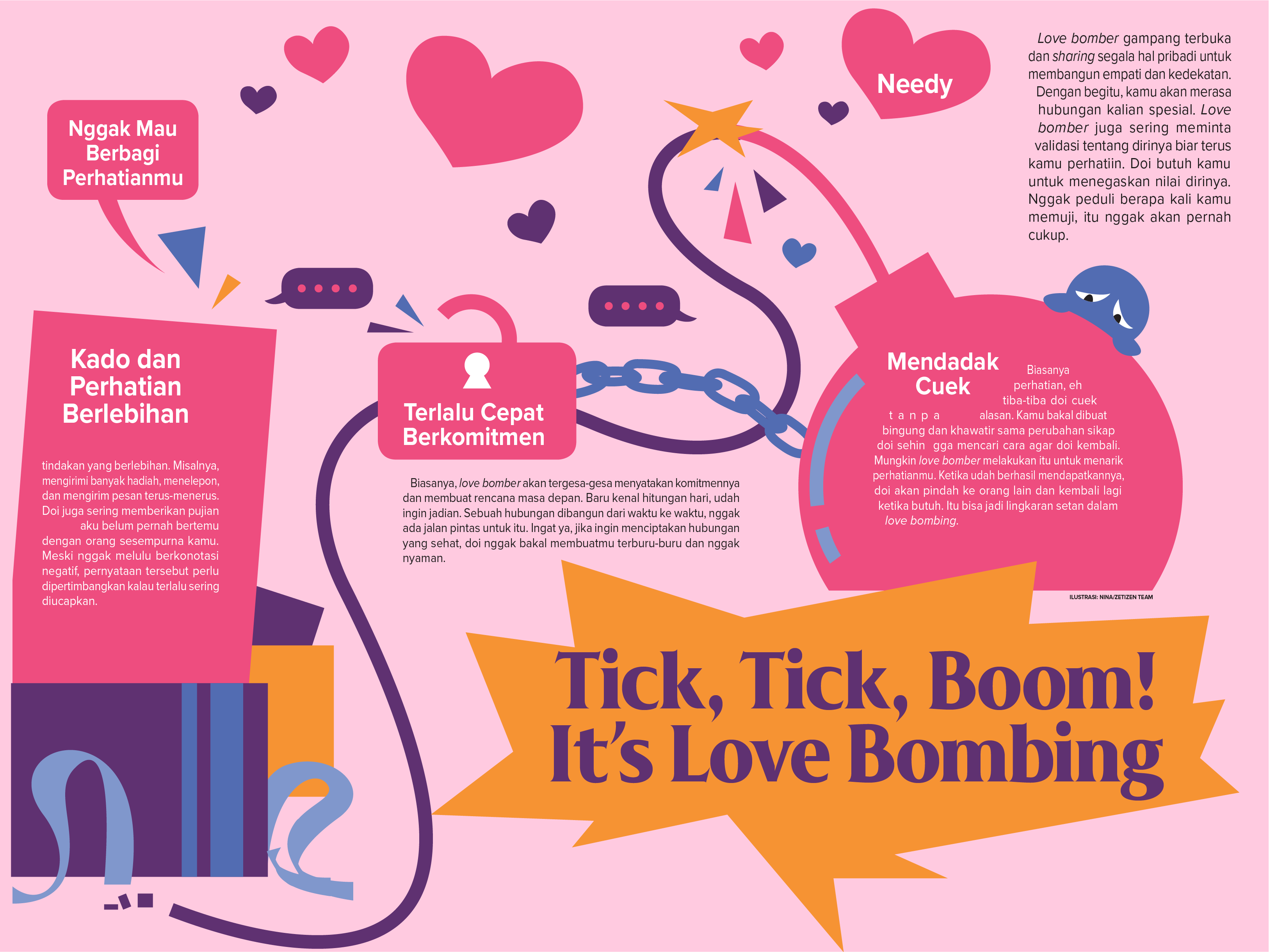 Love bombing adalah taktik manipulasi yang memilikisikap romantis berlebihan yang bisa bikin kita gak bisa menolak, berhitang atau berhantung pada si pelaku. Tapi ternyata tindakan love bombing bisa dikatakan berbahaya karena bisa menyebabkan seseorang melakukan sesuatu yang merugikan. Ketika pelaku mulai mengurangi perhatiannya, mereka akan cenderung melakukan emosional terhadap pasangannya, bisa saja mereka mengeluarkan kata benci, merendahkan, dan memuat pasangannya merasa tidak berharga. Duh jangan sampai kalian kjadi korban gais. Take care of yourselves!. (*)