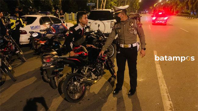 Kanit Turjawali Polresta Barelang, Ipda Yudhi Patra menindak pengendara motor yang menggunakan knalpot brong di Dataran Engku Putri, Batamcentre, Sabtu (4/6) malam. Foto: Yofi Yuhendri/Batam Pos