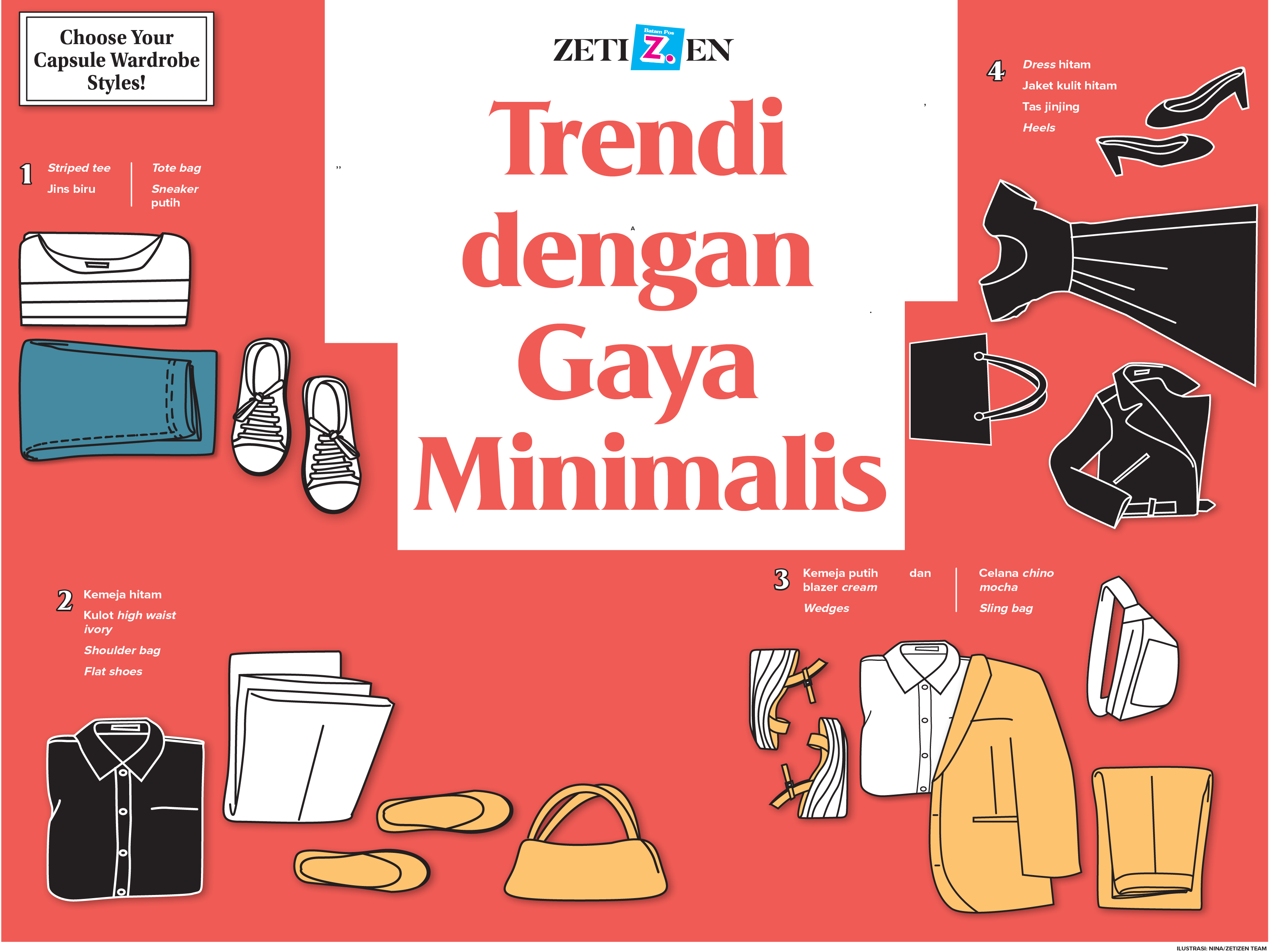 Ingin memiliki gaya hidup minimalis? Kamu bisa mencoba dari cara berpakaian yaitu dengan membuat capsule wardrobe (padu padan koleksi pakaian , ini bisa menjadi solusi untuk tampil modis dan mendukung. Jenis pakaian yang sudah diatur akan lebih menghemat biaya dan waktu. Tetapi dengan berkembangnya fashion kerap akan selalu ingin membeli baju baru demi terlihat up to date. Sayangnya justru menambah masalah yaitu bertumpuknnya koleksi pakaian yang belum tentu dipakai. Nah jika mengalami masalah ini, dengan membuat capsule wardrobe bisa menjadi solusinya? Bagaimana sih cara membuatnya? Yuk Simak! (*)