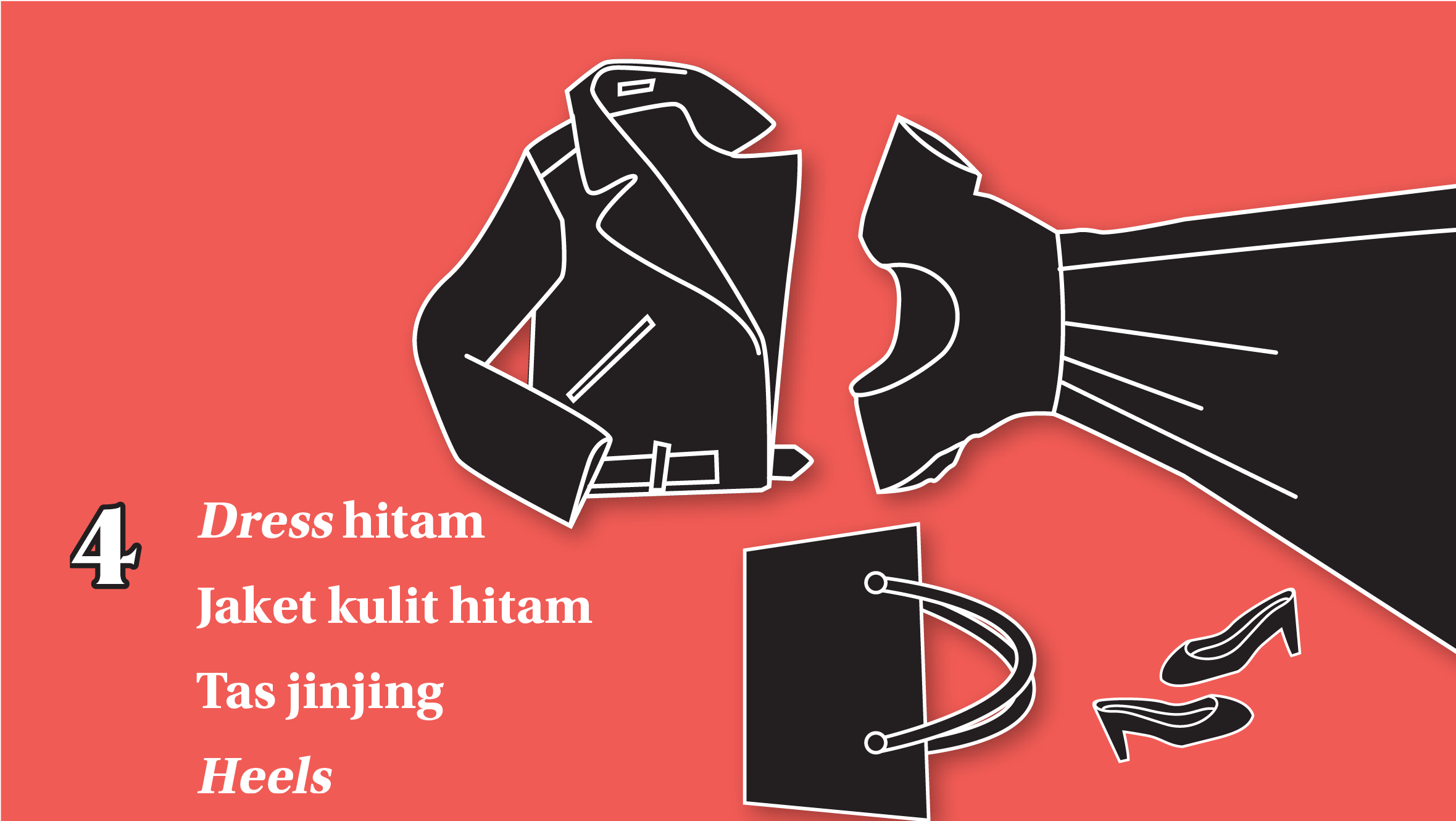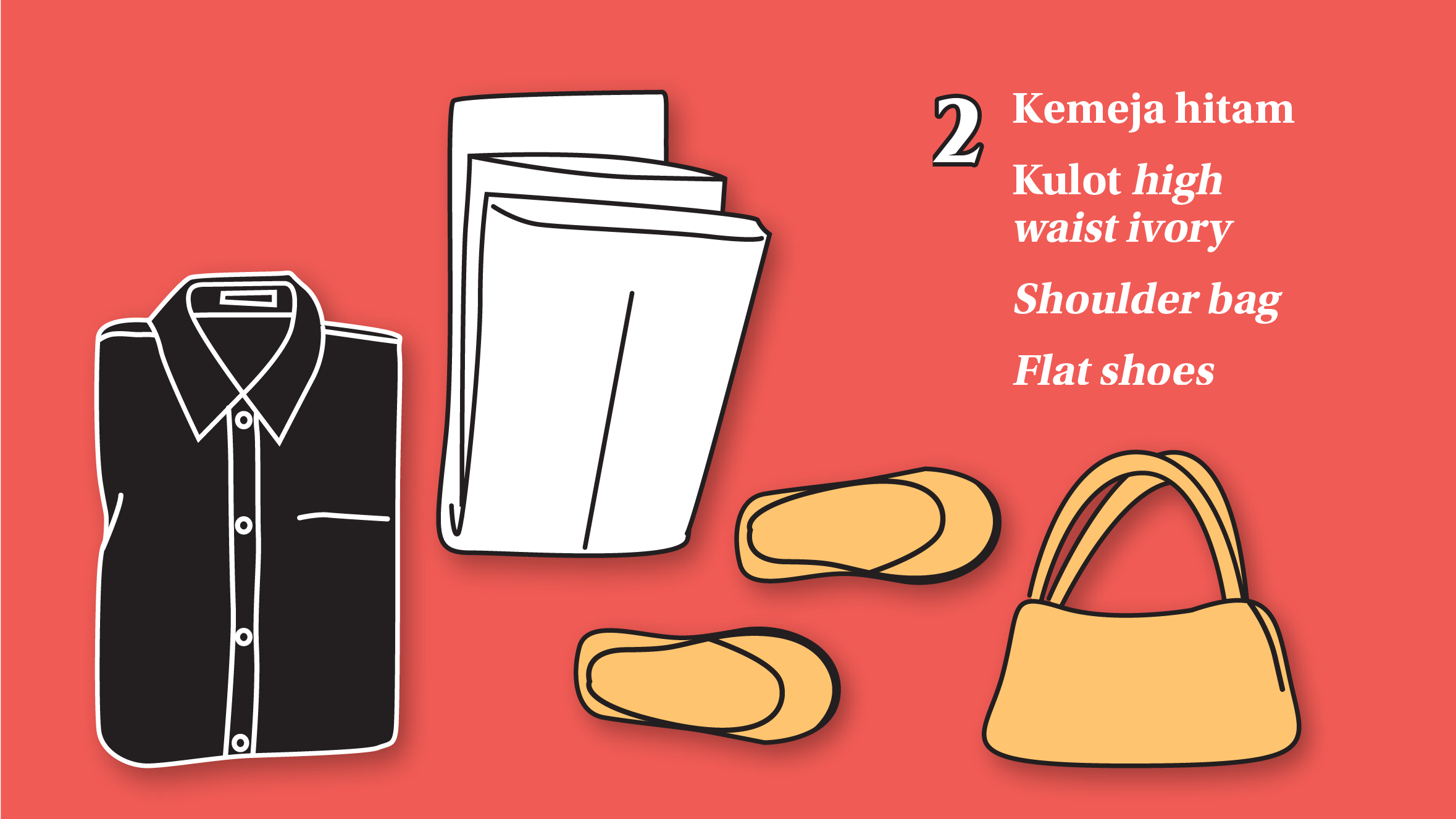 Membangun capsule wardrobe itu sangat bergantung pada kepribadian dan kesibukan sehari-hari. Bagi Asha, item yang diperlukan cukup celana hitam dengan potongan bebas, bisa chino, wide leg, maupun skinny. Celana tersebut cocok untuk tampil kasual hingga formal. Jins dan kemeja hitam atau putih juga wajib kamu miliki. Sebab, bisa dipakai berkali-kali dan versatile.