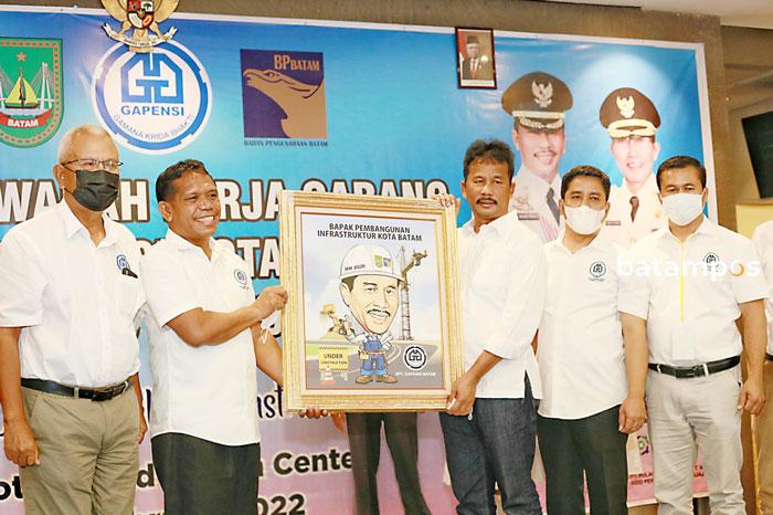 Ketua Gapensi Kota Batam, Sahaya Simbolon, memberikan penghargaan kepada Wali Kota Batam/Kepala Badan Pengusahaan Batam (BP) Batam, HM Rudi sebagai bapak pembangunan infrastruktur Kota Batam saat Mukercab I BPC Gapensi di Hotel Sahid Batam Center, Batam Kota, Kamis (17/2).