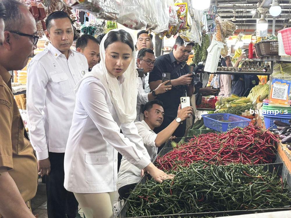 Wakil Menteri Perdagangan, Dyah Roro Esty Widya Putri, meninjau langsung kondisi harga dan ke­tersediaan bahan pokok di Pasar Summerland, Nongsa, Batam, Senin (9/3). Foto: Yashinta/Batam Pos